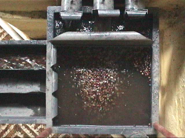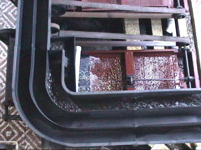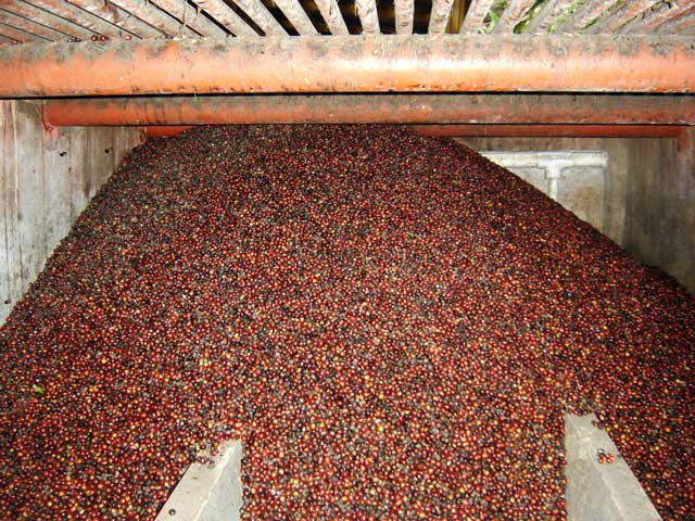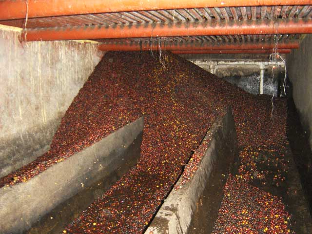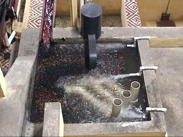 Coffee cherries are received in semi-dry receivers (Pic 8, Pic 9 and Pic 10), from which, the re circulated water transports the coffee to a 1.87 cubic meter siphon, which remains full of water during the entire pulp extraction process (Pic 11, Pic 12 and Pic 13). The siphon separates the low-density coffee cherries from those with a higher density. In other words, heavy coffee cherries continue the process, while floaters are excluded from it. High density coffee cherries are conveyed by water pressure to a pebble separator, preventing the introduction of pebbles and any other foreign objects to the de pulping machines (Pic 14). Coffee cherries are then carried by recirculated water to the de pulping machines where the pulp is removed to expel the two coffee beans from within the fruit (Pic 15, Video 1, Video 2 and Video 3). These coffee beans are transported by the same re circulated water to fermentation tanks in which they remain untouched until optimum fermentation is reached, in order to naturally separate the beans from the mucilage covering the parchment of the coffee beans (Video 4 and Video 5).