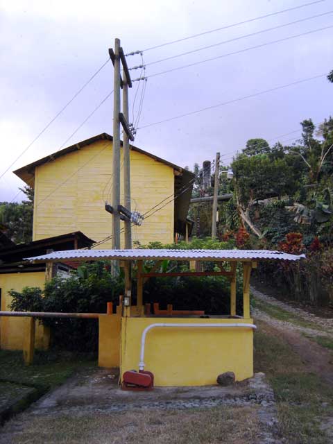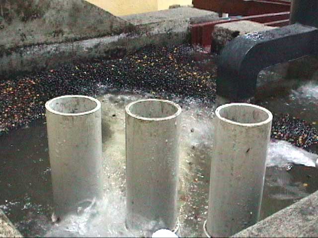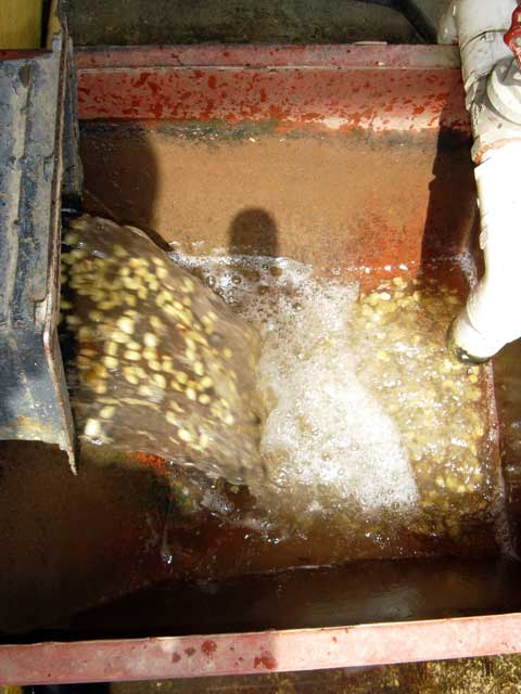 Once optimal fermentation is accomplished, coffee beans are conveyed to a concrete channels measuring one meter high, forty centimeters wide, with an inclination of two point five percent (Pic 17, Pic 18, Pic 19 and Video 6). These channels main purpose is again, to separate high density beans from those of lower densities. This is the second separation stage; carried out under the same bean density principles used in the first stage. High-density coffee beans continue the process and are washed, while floating coffee beans are removed from the process and treated and processed separately as low-quality coffee beans. An independent water circuit is used to convey coffee beans from the fermentation tanks to the separation concrete channels. Subsequently to separation, coffee beans are transported employing the same water to a washing machine in which coffee beans are washed and separated from the wastewater. The water employed for this process belongs to a closed circuit of three cubic meters. This water carries coffee from the fermentation tanks to the separation channels, helps to separate the floating coffee beans, and washes the coffee in the washing machine or pump. Coffee is pump-washed, and then conveyed through a pipeline circuit where coffee ends its washing stage. Once coffee goes through the washing pump, it is separated from the wastewater through an “adelio”, propelling the coffee beans to a sorting pipe which is the third classification stage (Pic 20 and Video 7). The water employed to transport coffee beans to the separation channels, separating coffee beans and transport the beans to the washing pump is replaced on the daily basis (Pic 21). Once this water has been employed, the same becomes part of the closed water circuit for pulp extraction, due to the fact that during the pulp extraction process, water was lost through absorption by the pulp and water levels need to be maintained.