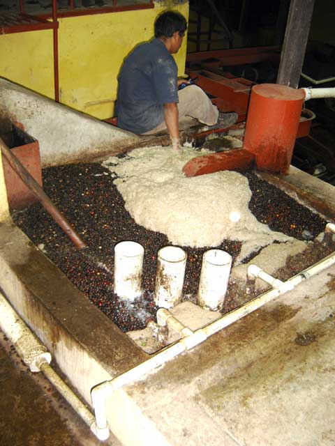 Such fermentation must be closely monitored, and the time to achieve it depends on; the environmental temperature, relative humidity and the amount of pectin and bacteria in the water. If water has already been recirculated several times, it is rich in bacteria and pectin, which reduces the fermentation time. If the minimum temperatures are too low, fermentation takes more time. For such reason, a strict fermentation control is required to obtain a healthy, flawless cup quality. The gap between excellent and rotten is a matter of minutes. The same water, conveying coffee cherries to the de pulping machines, transports the coffee pulp; through a non-water leaking pipeline to a helicoid, which separates the pulp from the water and conveys the pulp to a blower that evenly spreads it under cover. Coffee pulp remains under cover for a controlled aerobic decomposition in order to serve as earthworm feed (Pic 16). Coffee pulp is recycled into an organic fertilizer. Water returns to the re circulation circuit. Any water that may have been absorbed by the pulp is drained with time, and goes directly to the clarification tanks to be treated as mentioned above.