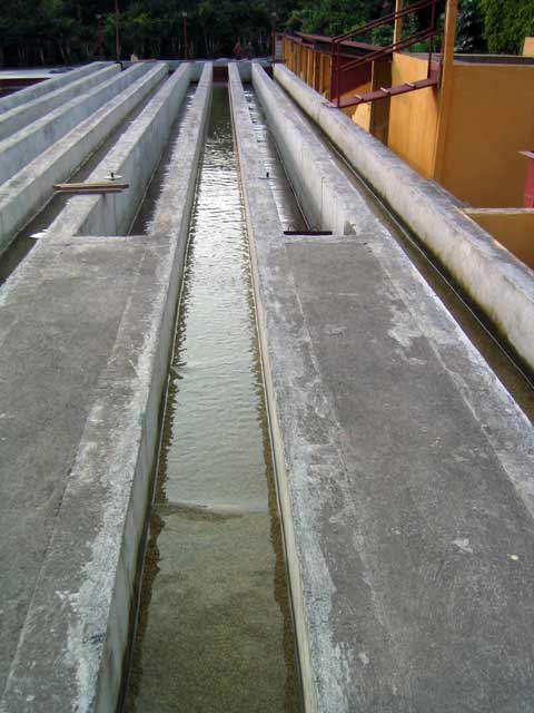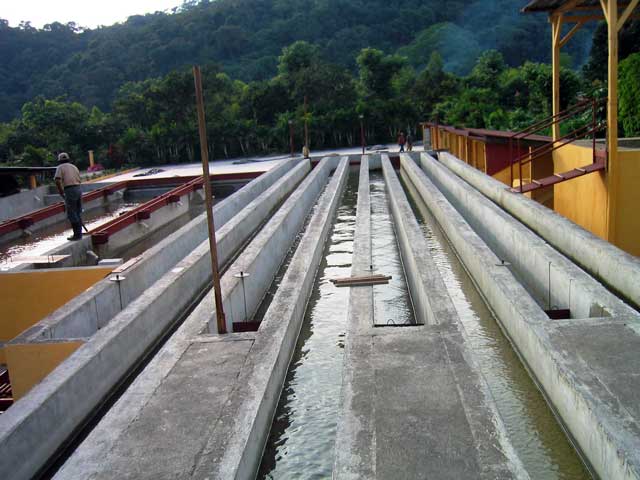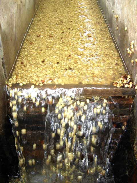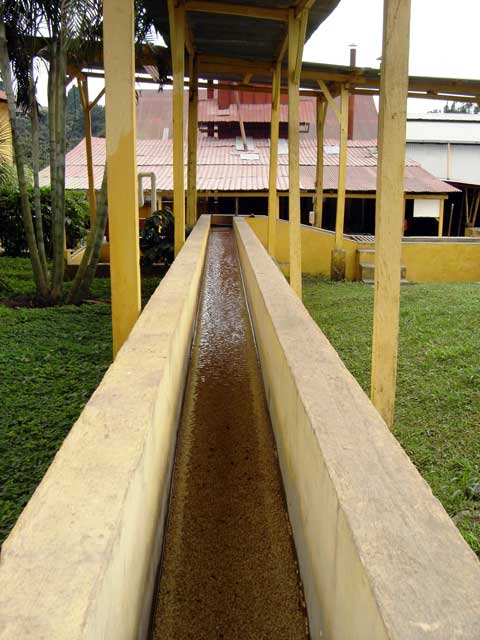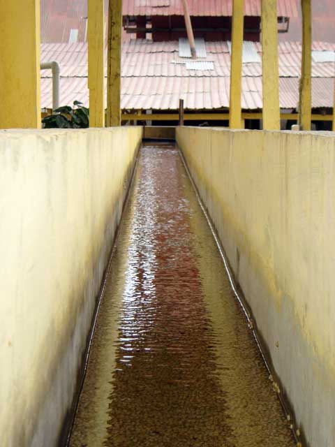 While in the sorting pipe, coffee beans are mixed with clean water (Video 8 and Video 9). In the sorting pipe, the third sorting and separation stage begins. Once again, high-density coffee beans are separated from those with low density. Subsequently, coffee is conveyed by clean water to concrete channels of laminate flow. These channels are thirty centimeters high, forty centimeters wide with less than one percent inclination. In these concrete channels coffee beans experience a fourth and last separation process in the wet mill process (Pic 22, Pic 23, Pic 24 and Video 10). In this stage, coffee beans flow in water inside the eighteen meter channel. The slight inclination and subtle water pressure allows low-density coffee beans to roll over high-density coffee beans and be deposited in the last two meters of the eighteen meter channel. All the coffee beans deposited in the last two meters of the channel are removed from the process and become part of low-quality coffee beans which are processed separately. Water employed in the sorting pipe and the concrete channels of laminate flow, is pectin and bacteria free and meets the DQO requirements to return to the water-bearing strata with no risk of contamination. However, we have the infrastructure to recirculate and treat such water as well.